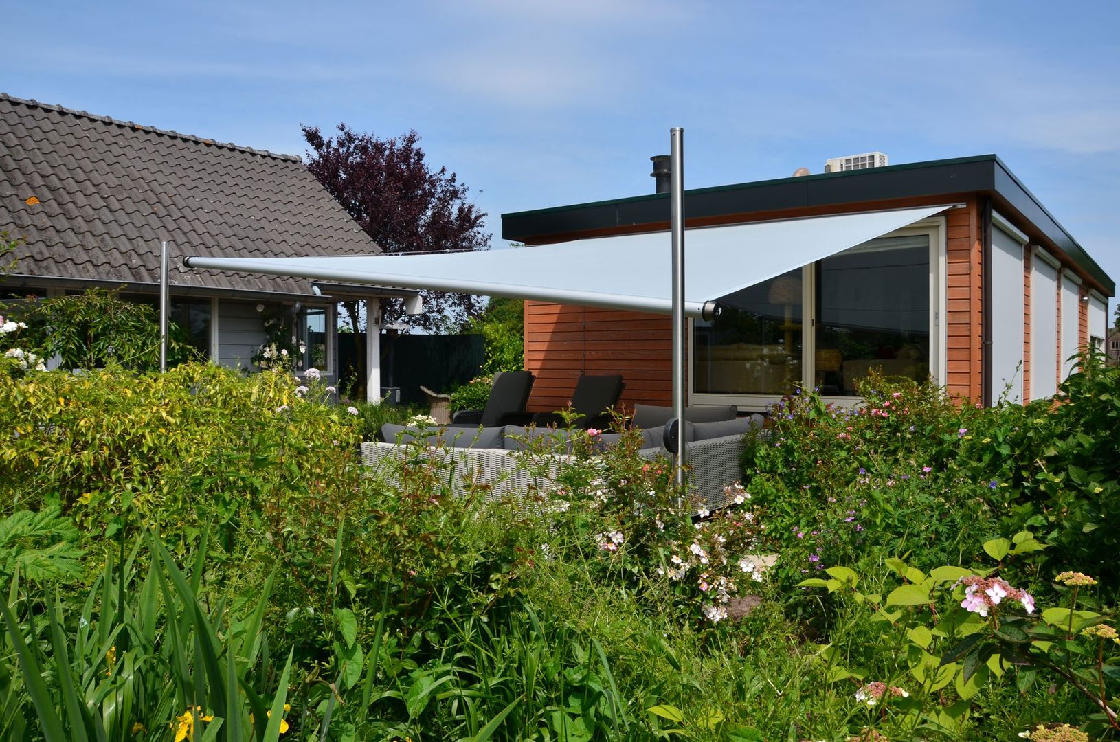 Ob Terrasse, Freisitz, Dachgarten, gastronomische Außenfläche, Balkon, Poolbeschattung oder Innenhofbespannung – durch den modularen Aufbau lässt sich mit dem SHADEONE® Twister-Segel nahezu jede gewünschte Fläche beschatten.